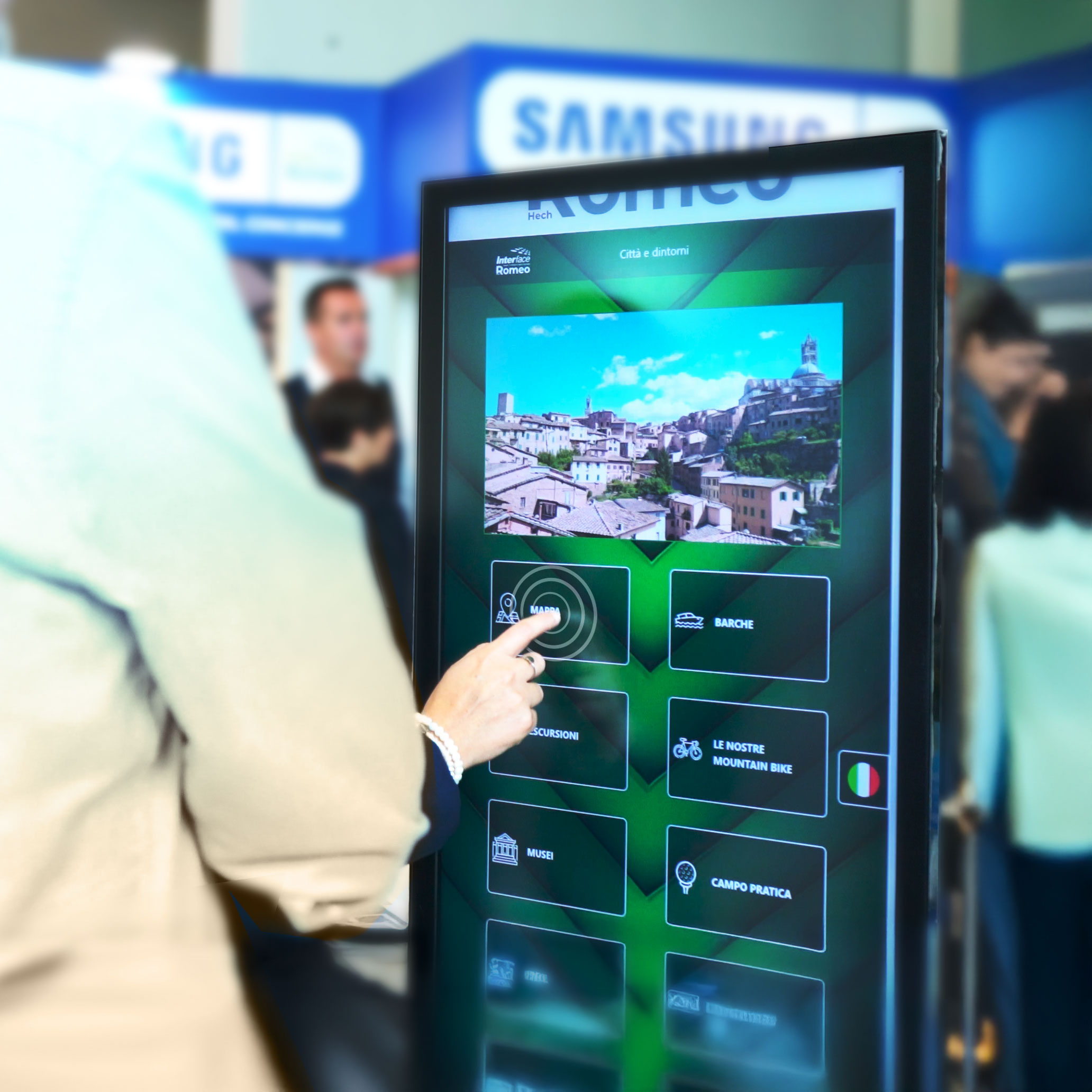 Installa totem touch screen nella tua struttura, in modo da dare accesso immediato alla tua web app Hech Romeo ai tuoi ospiti.