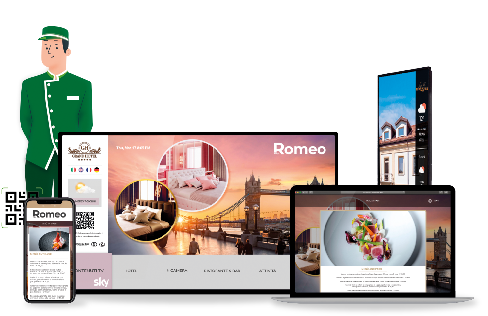 Affrontare l’investimento di innovazione parco TV e digitalizzazione della struttura Ricettiva significa mettere in campo competenze di tecnici specializzati nella corretta configurazione non solo degli apparecchi TV ma anche dei loro contenuti informativi. Affidarsi a un Team specializzato e al suo circuito di tecnici, providers e installatori, significa garantirsi il risultato con una comunicazione efficace e un sistema di gestione sempre all’avanguardia: Hech Romeo