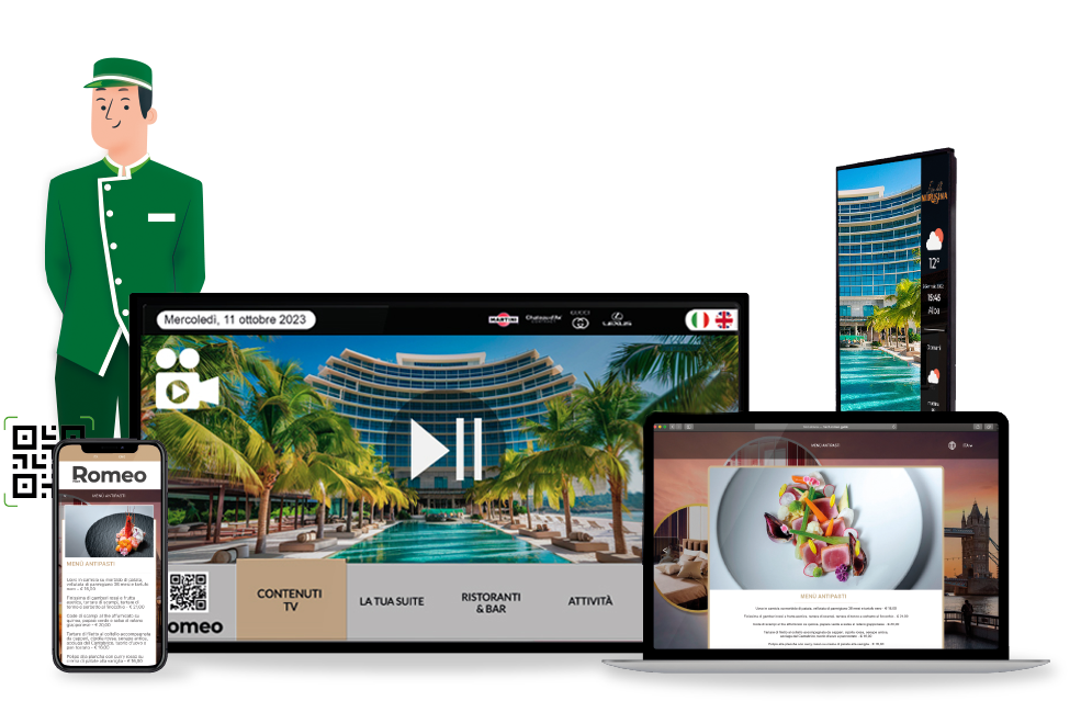 Come funziona? E se gli ospiti non hanno spazio sul cellulare? Hech Romeo è basato su Web App ovvero un comodo portale accessibile dalla TV e da qualsiasi dispositivo (smartphone, tablet e PC) dei tuoi ospiti. Non serve scaricare nessuna app, basta collegarsi dall’interfaccia della TV o scannerizzare il QR code e cliccare sul link erogato.